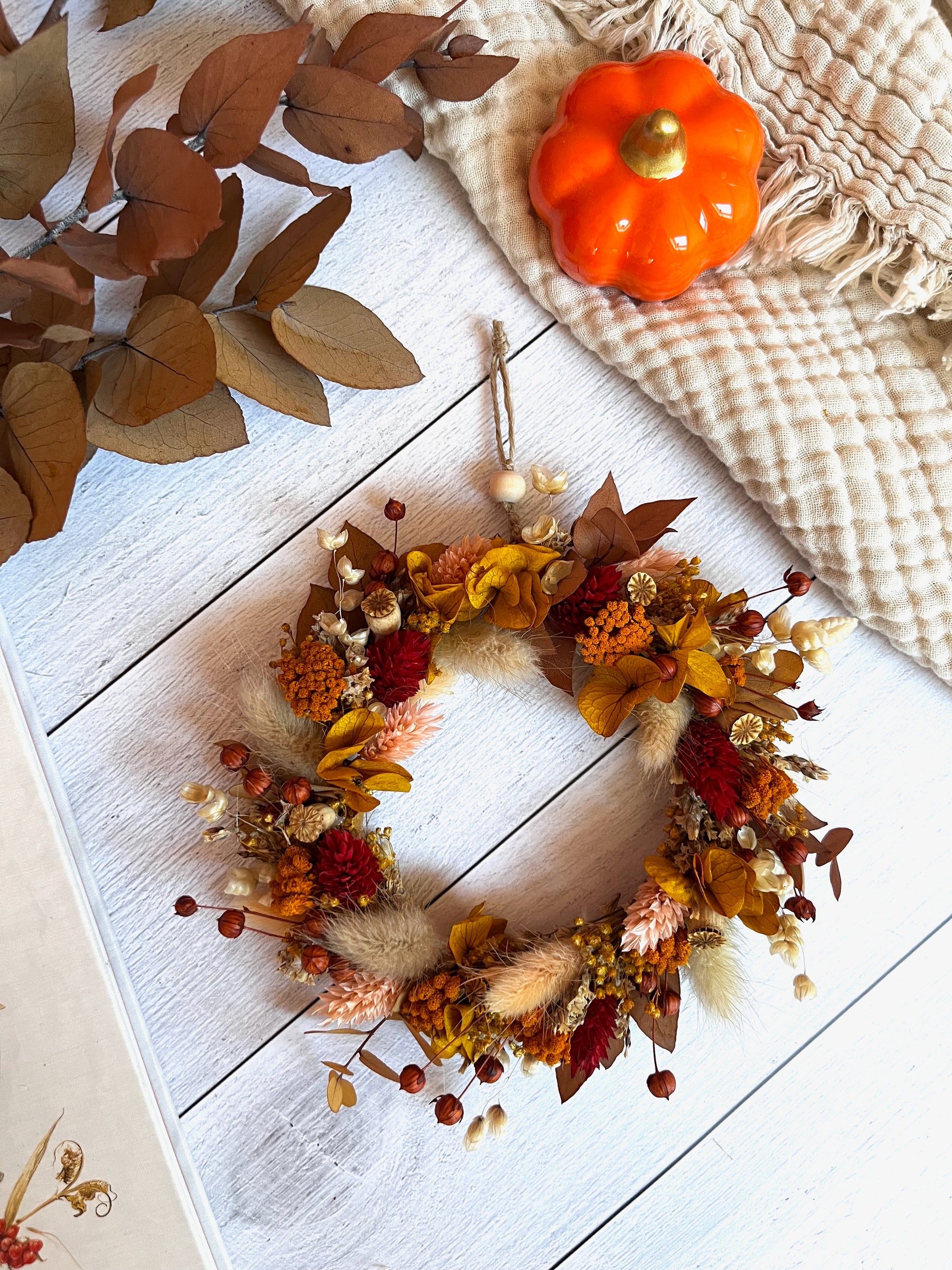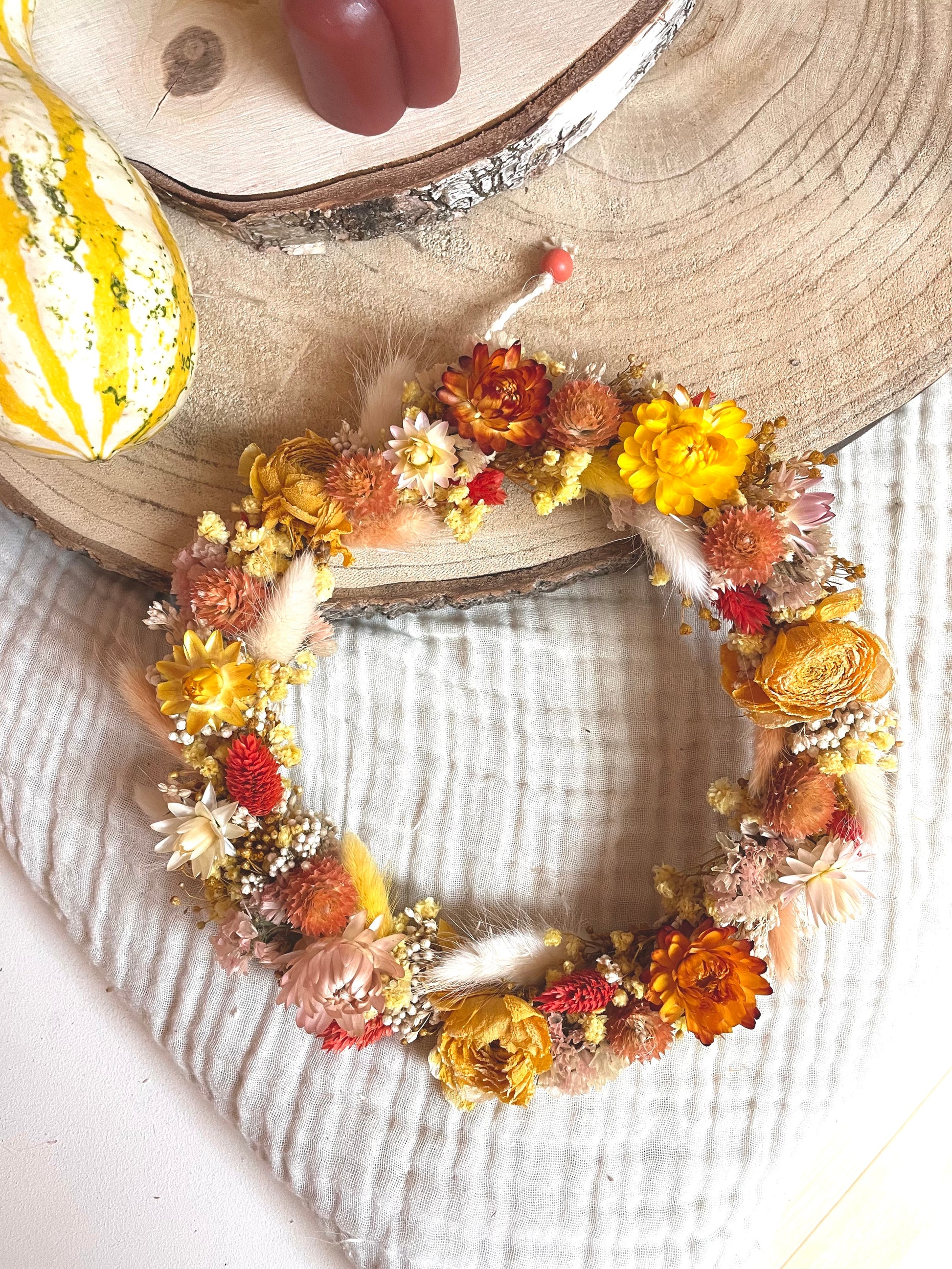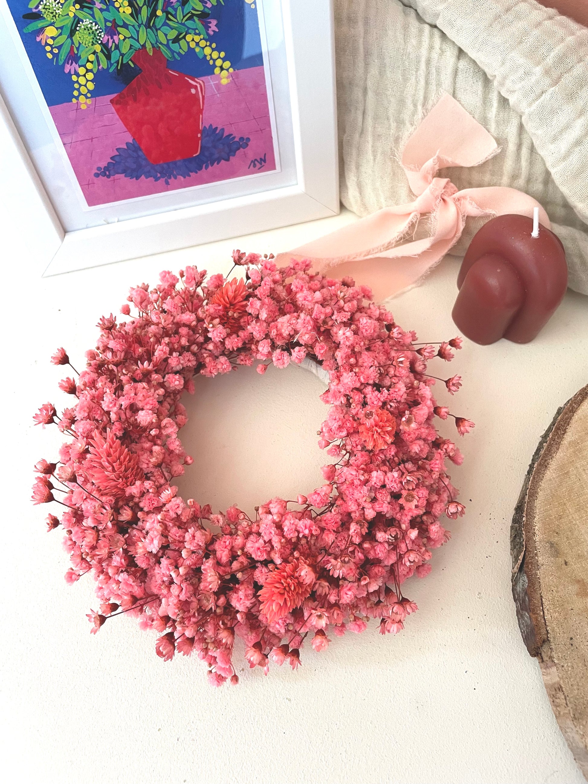 Les couronnes murales en fleurs séchées sur mesure sont imaginées et réalisées à la main dans mon atelier, spécialement pour vous. Véritables pièces décoratives, elles apportent une touche poétique, naturelle et intemporelle à votre intérieur.