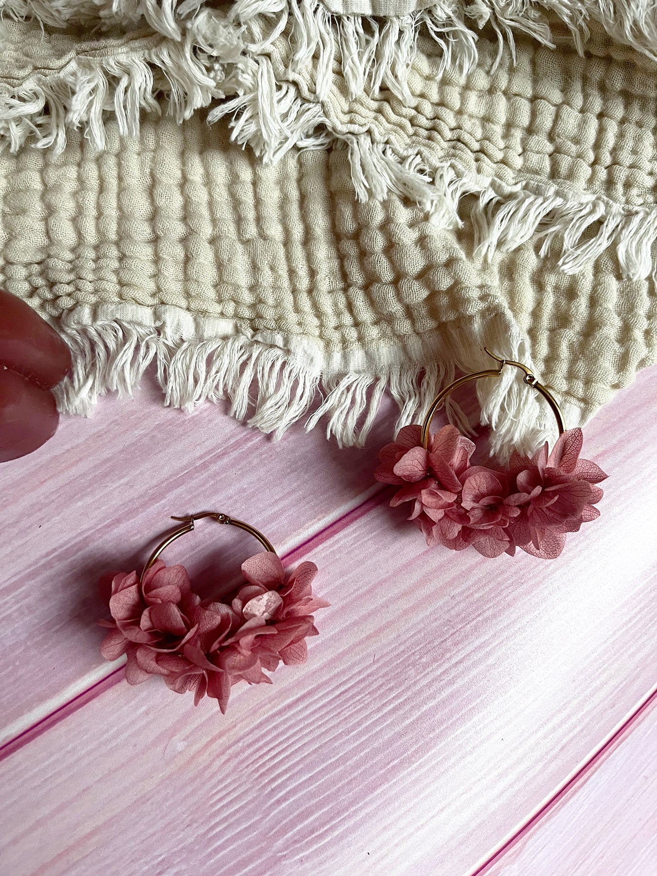 Chaque paire est ornée de pétales d'hortensia stabilisé vieux ose. La stabilisation permet de conserver l’aspect naturel de la fleur sans entretien particulier, tout en préservant sa texture et sa couleur.