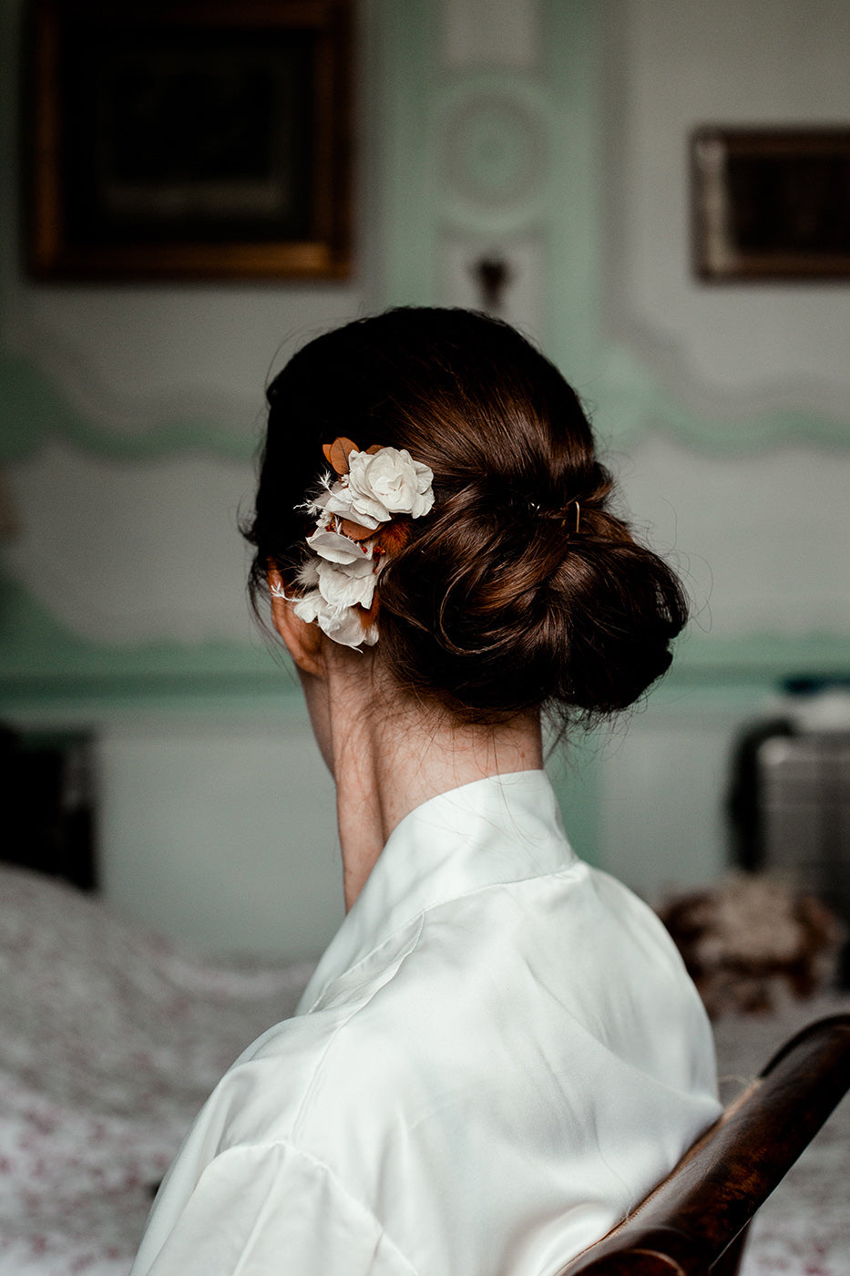 Pensez également à une couronne de tête ou une barrette pour un mariage tout en harmonie. Pour les hommes, optez pour une boutonnière en fleurs séchées assortie, confectionnée à la main avec la même exigence de qualité.